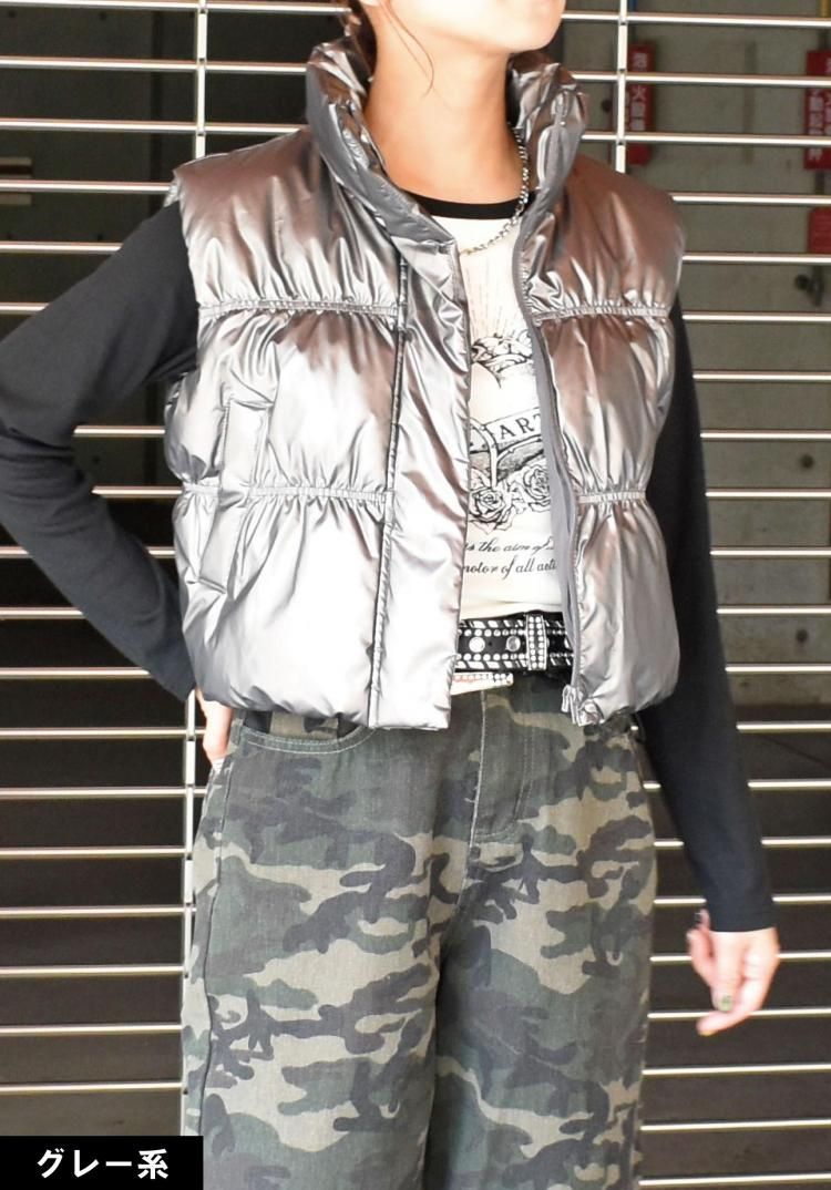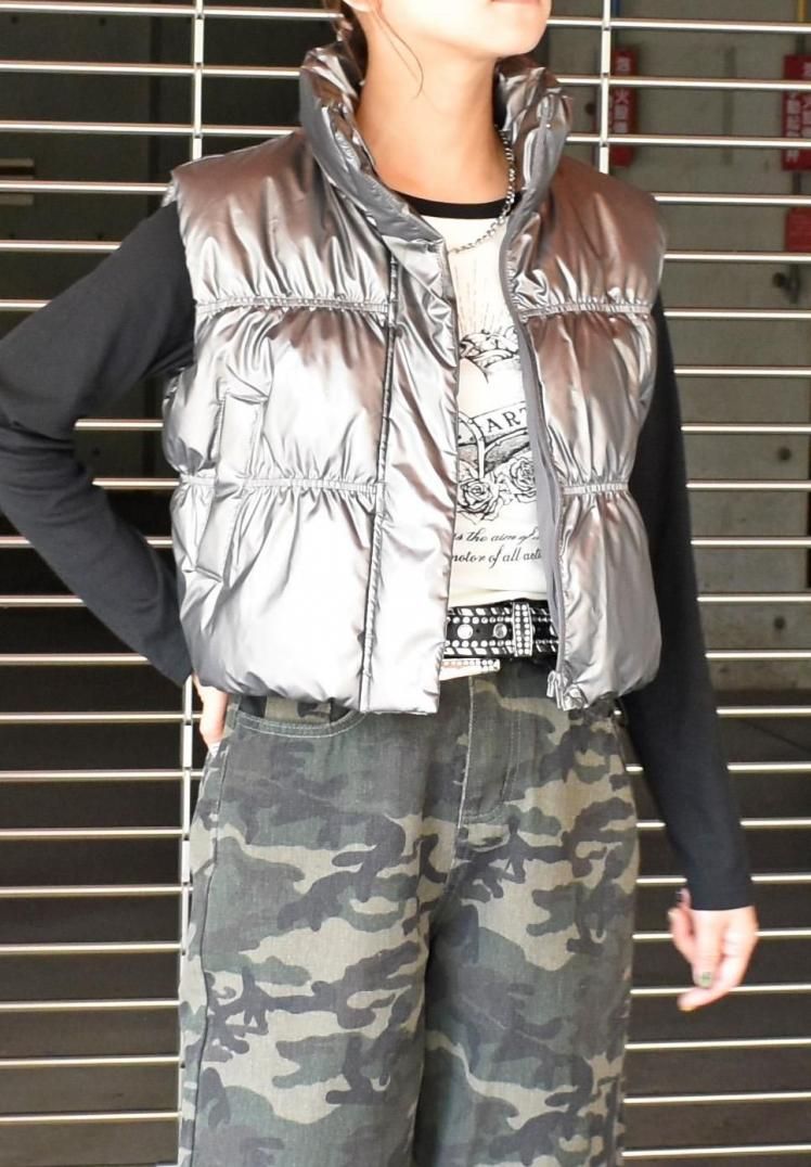 光沢のあるメタリック素材が目を惹き、コーディネートの主役になるアイテム。