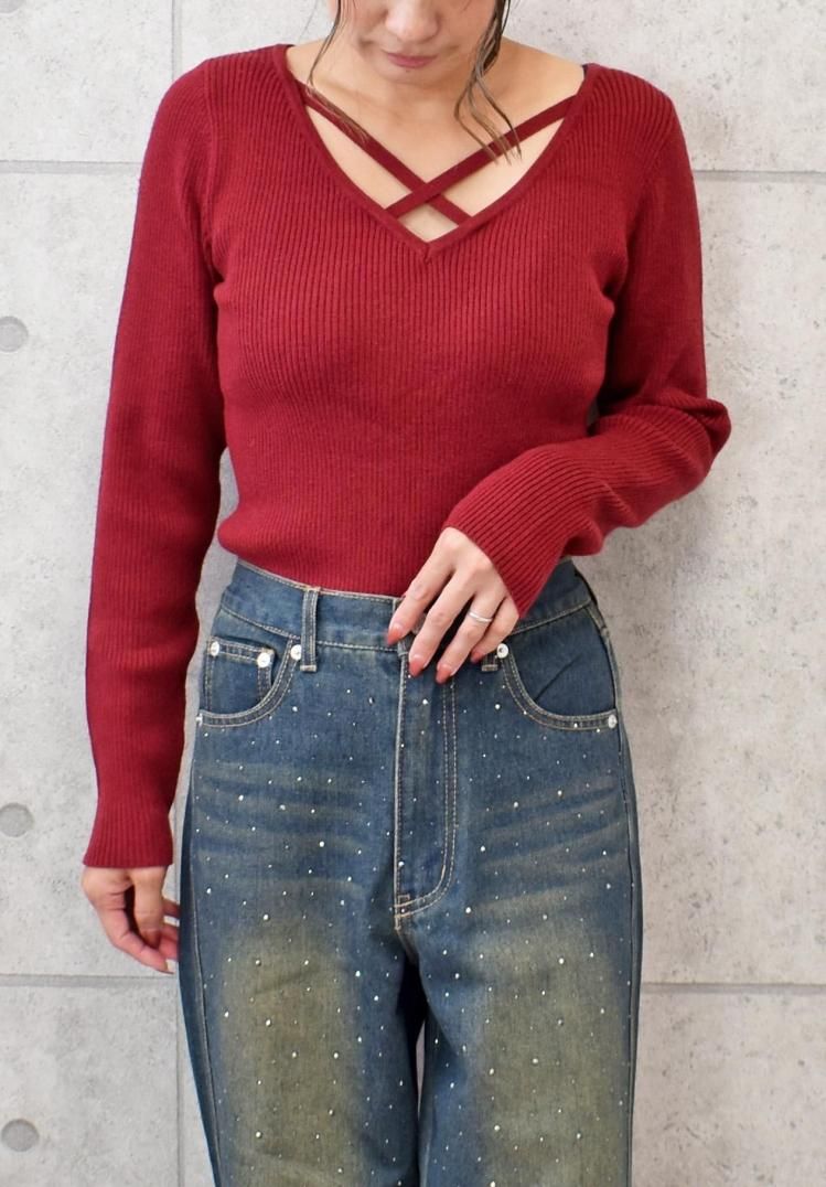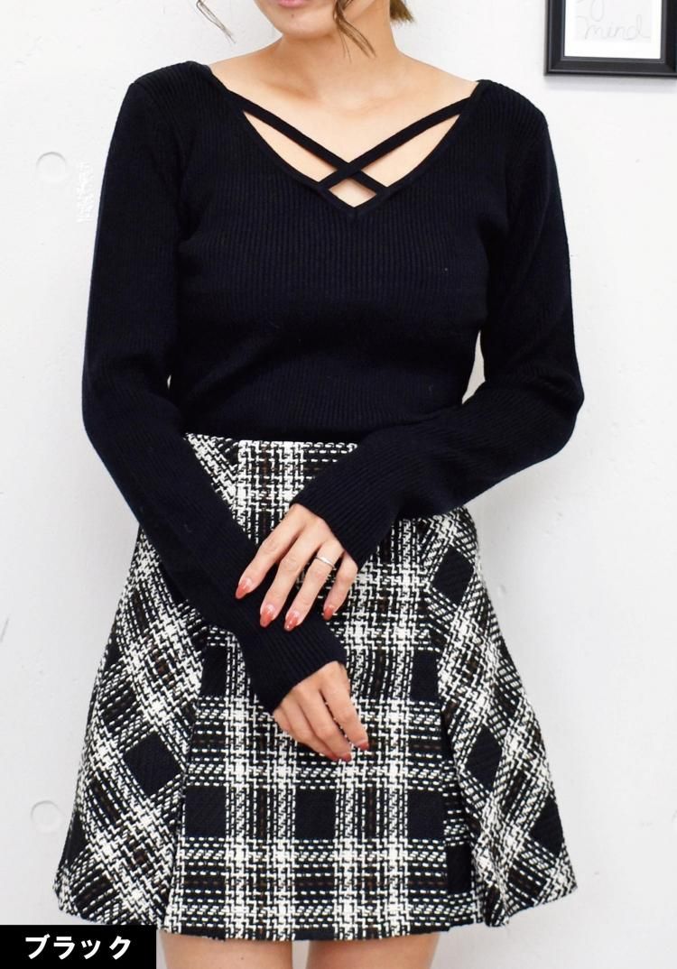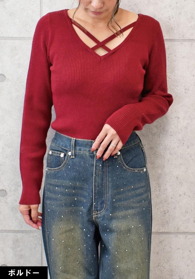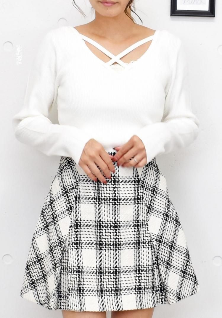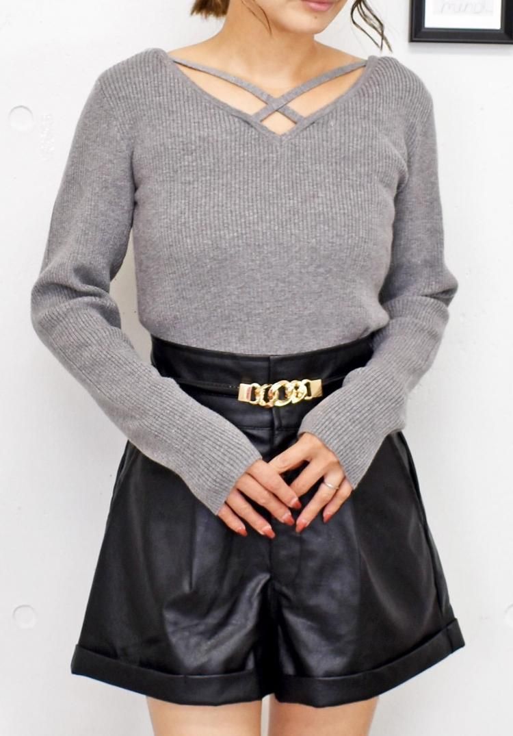 シンプルなリブニットにアクセントを加えて、おしゃれ度をアップします。