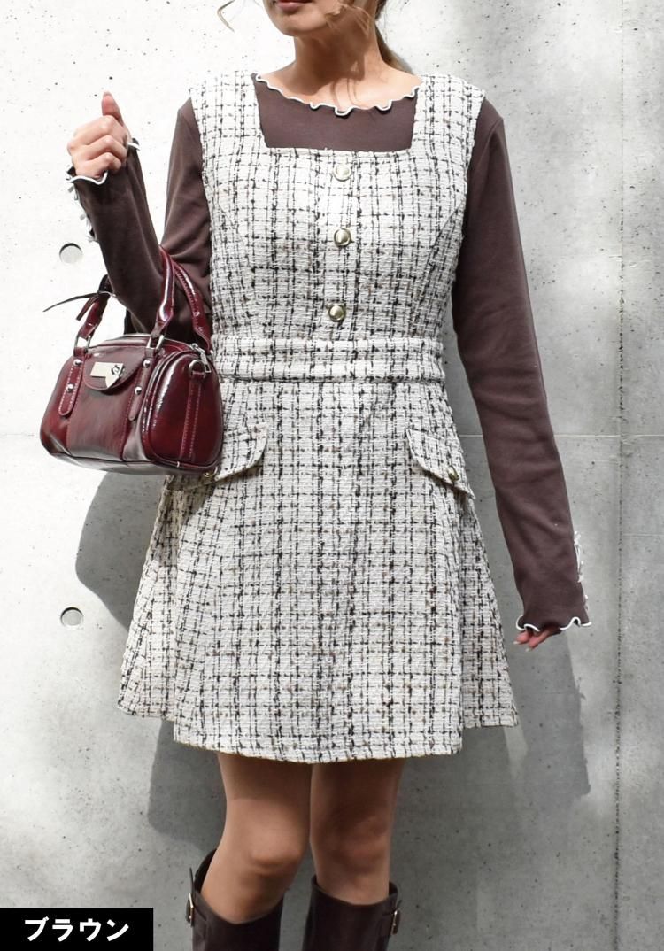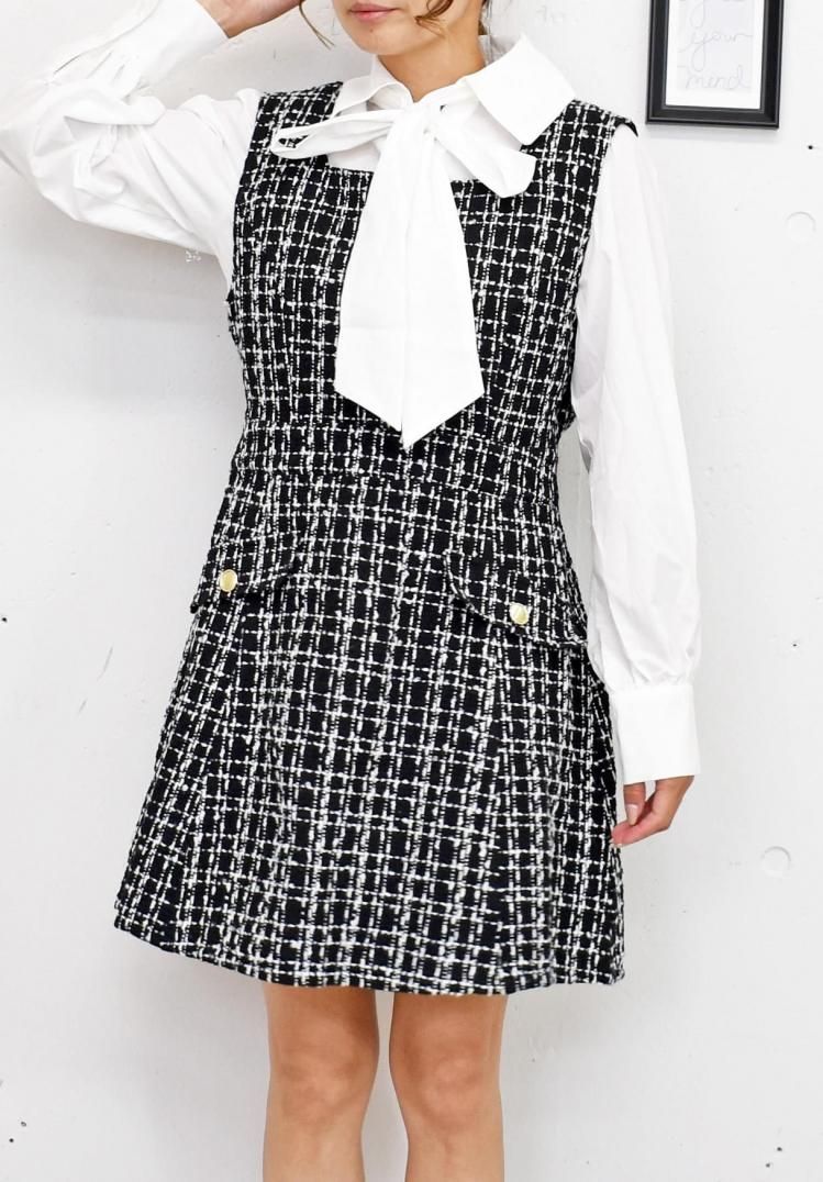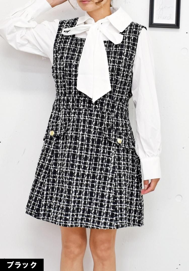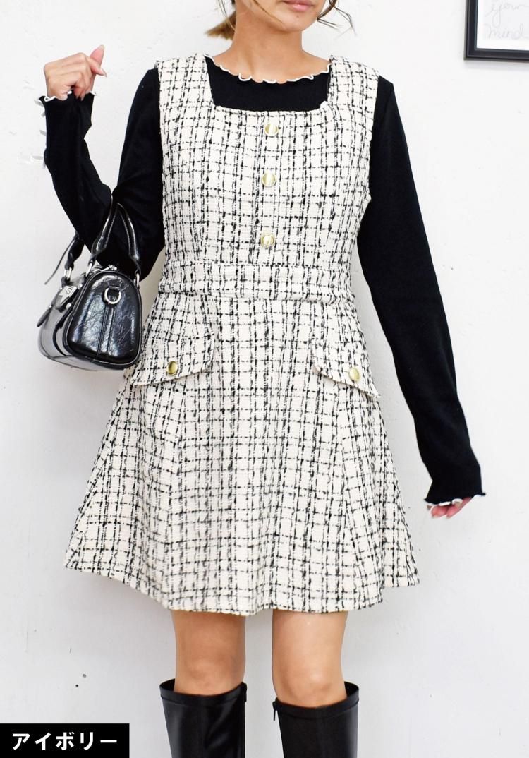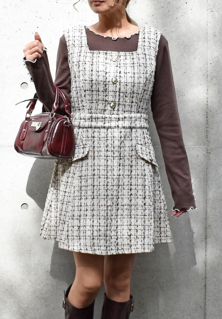 上品なツイード素材がクラシカルで高級感があり、季節を問わずエレガントに。