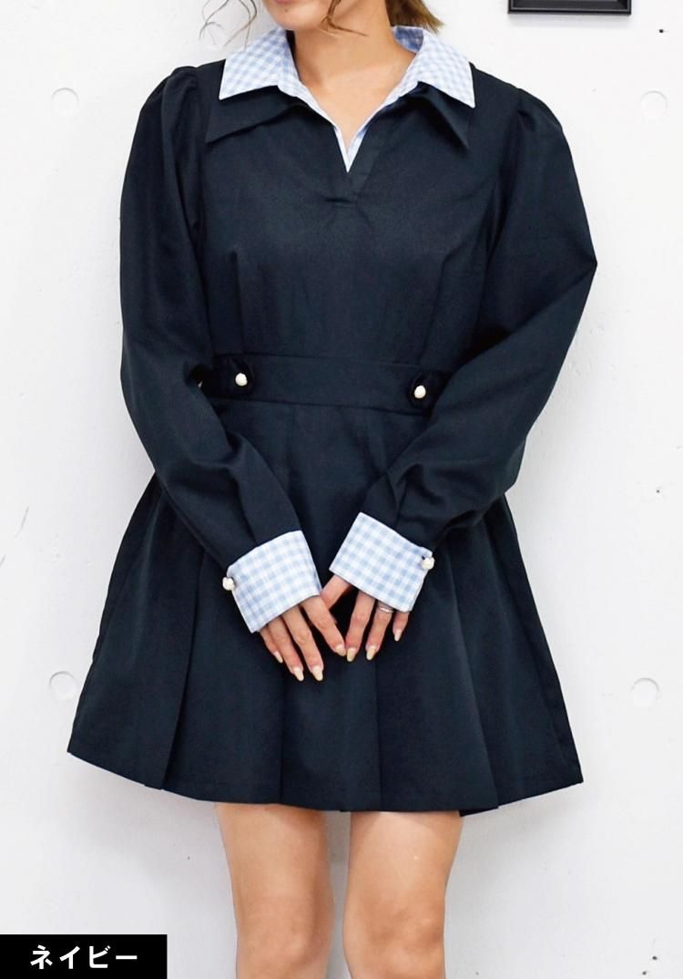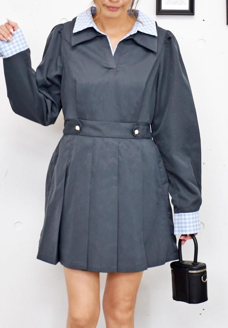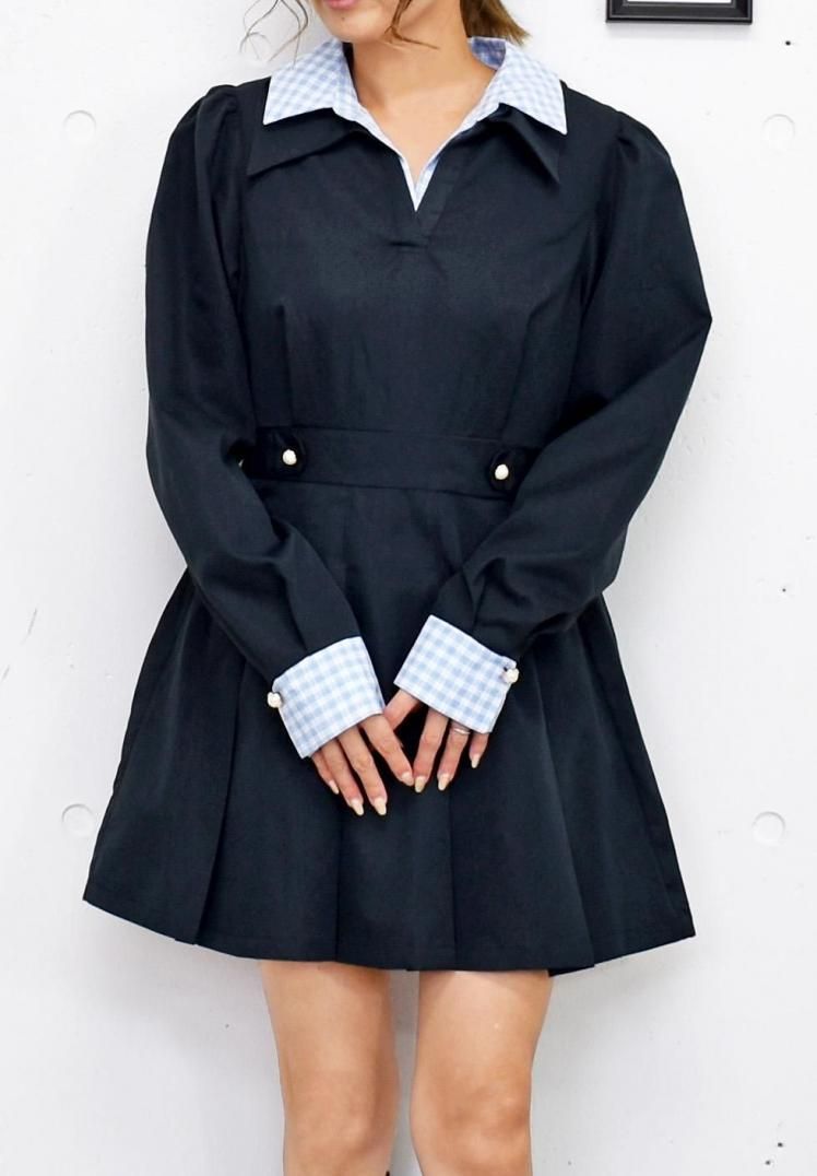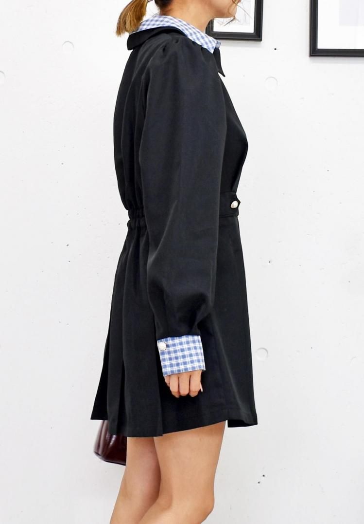 シックな色展開を基調に、チェックの襟元と袖口がアクセントになり、上品ながらも遊び心を感じられるワンピース。