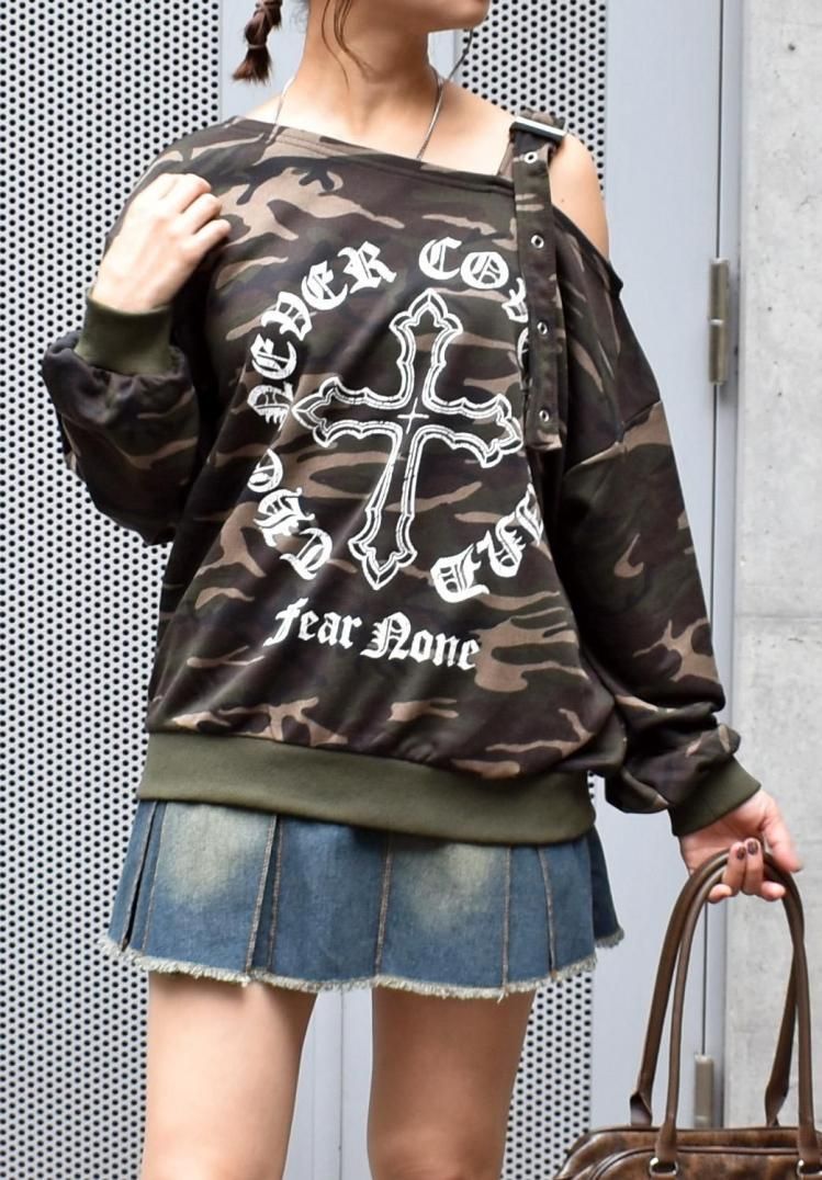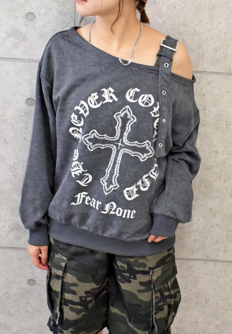 大きくプリントされたクロスモチーフとメッセージロゴが、ロックやストリートテイストを演出し、一枚で強い個性を発揮します。