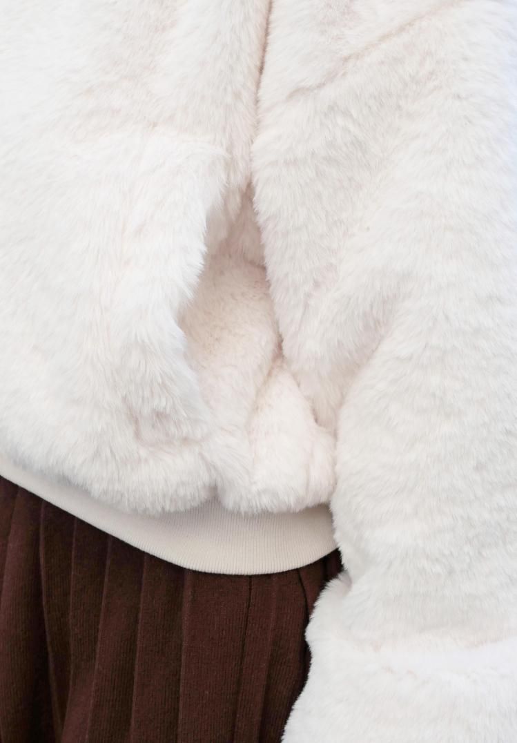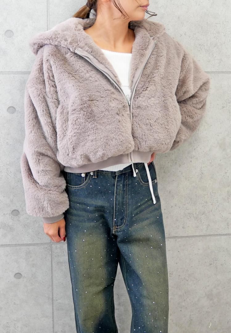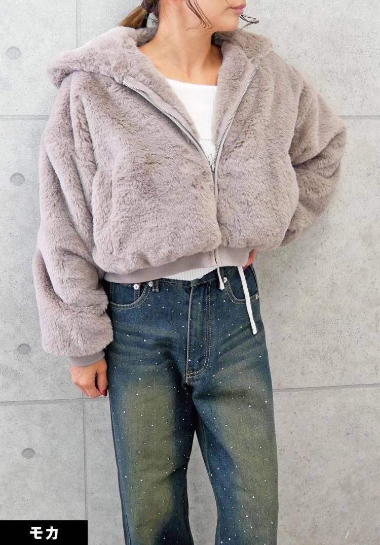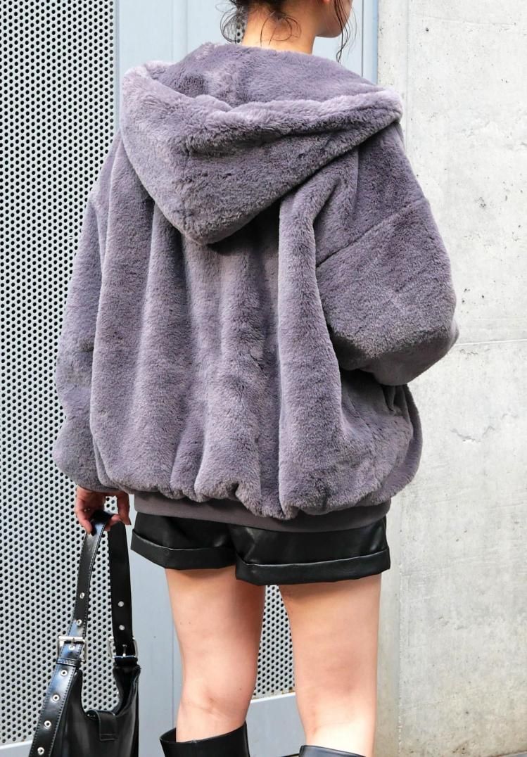 ふわふわのファー素材とフードにより防寒性が高く、ジップアップ仕様と両サイドのポケットで実用性も兼ね備えしたファーブルゾン。