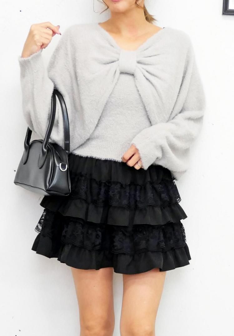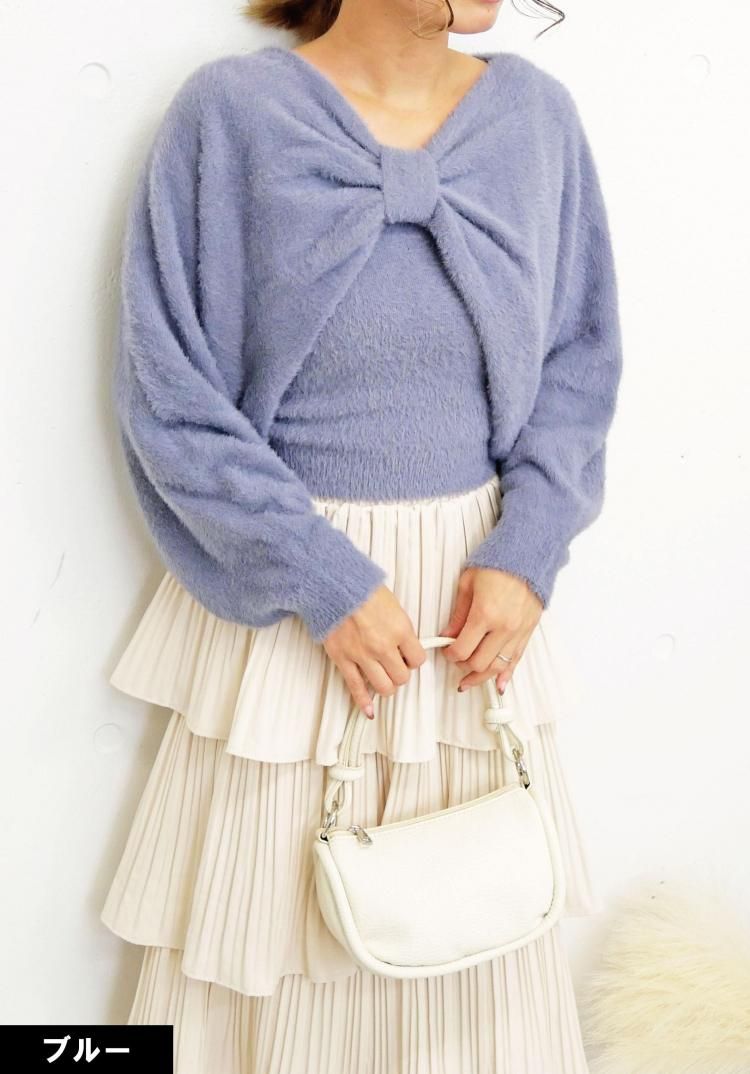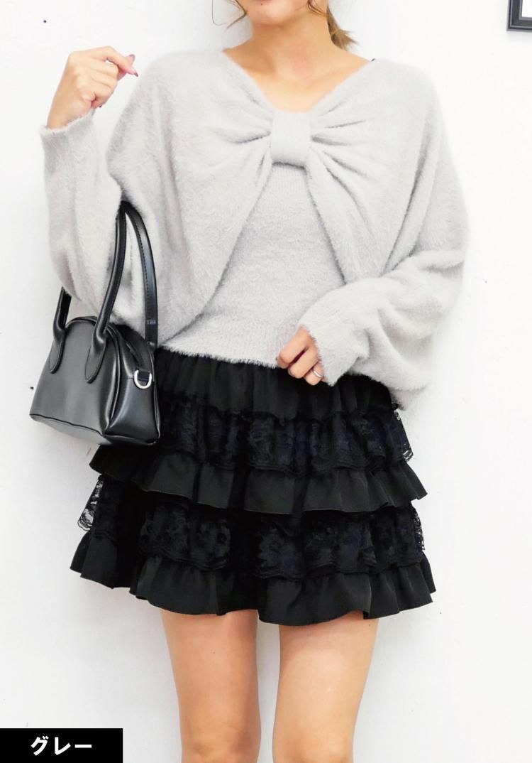 リボン付きのボレロとキャミソールがセットになった、フェミニンで華やかなアンサンブル。