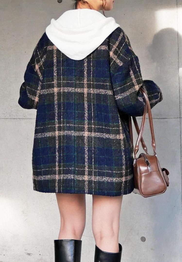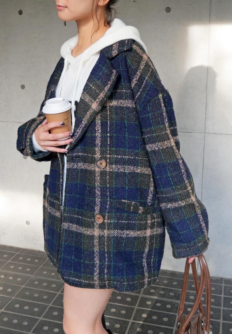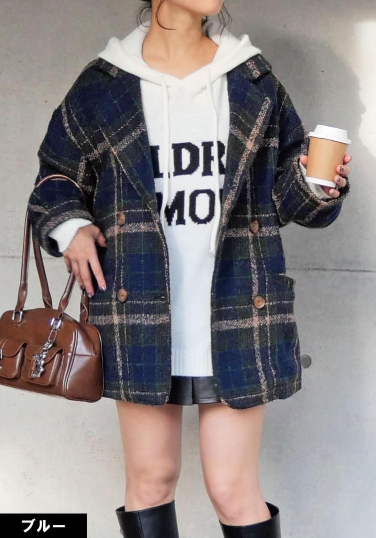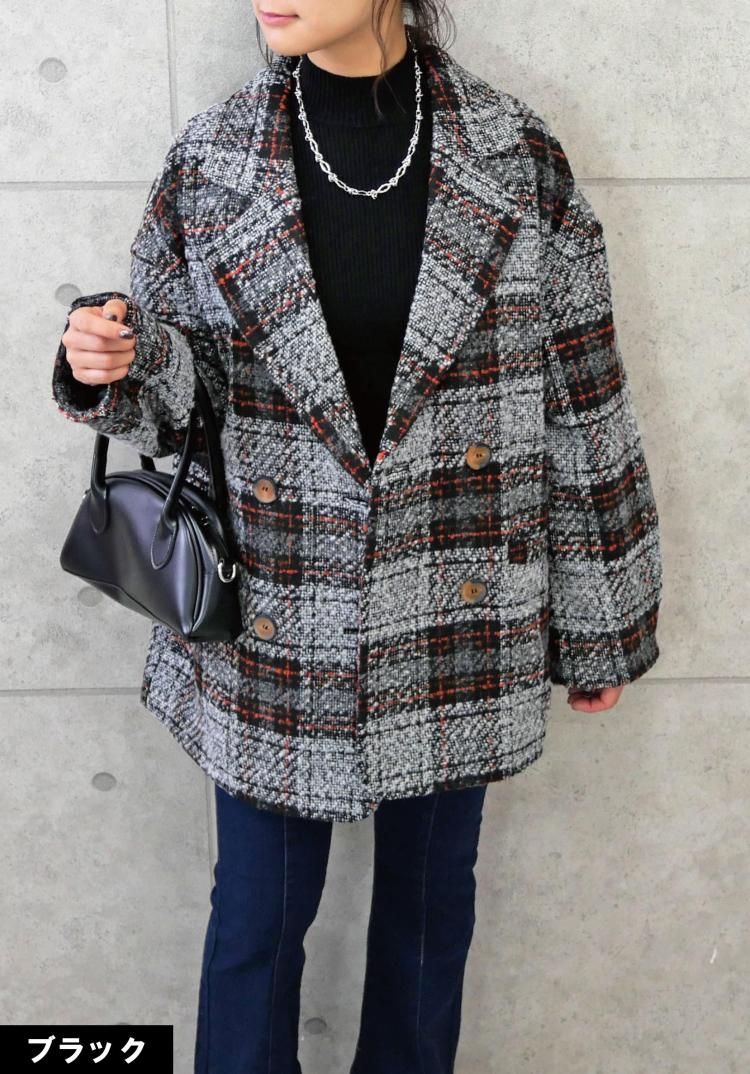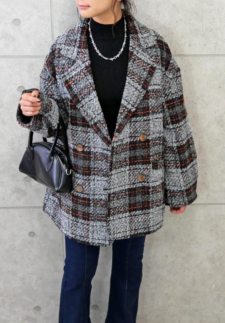 ツイード調のチェック柄が秋冬らしい温かみとクラシックな雰囲気があり、着こなしに深みと季節感をプラス。