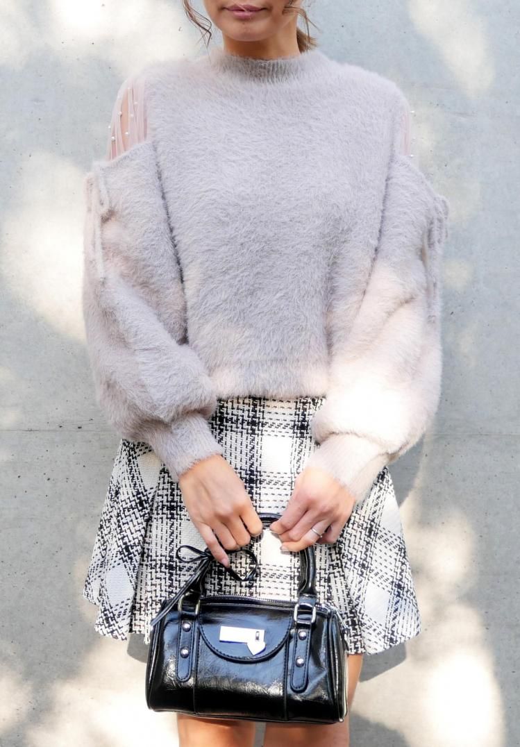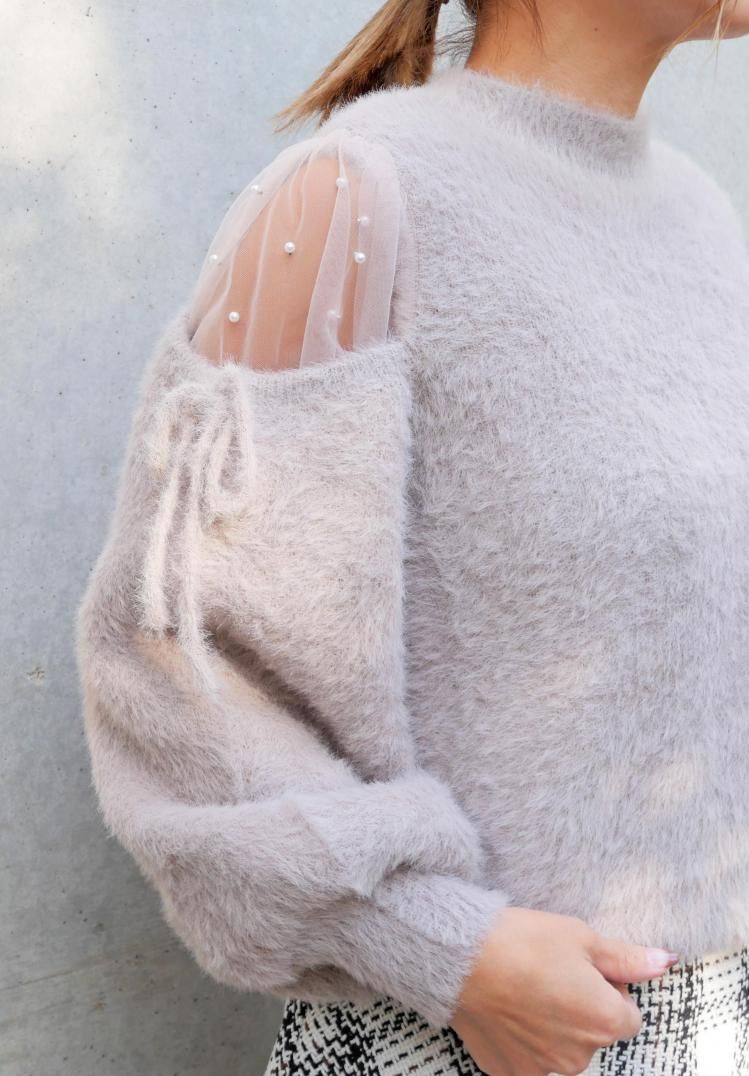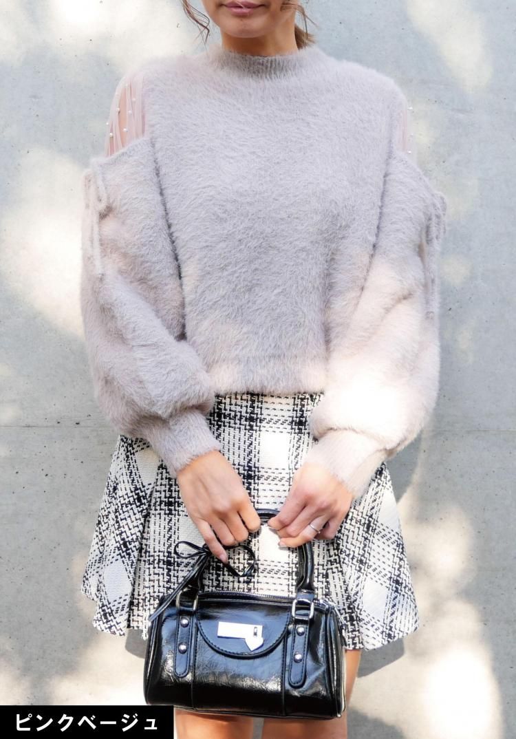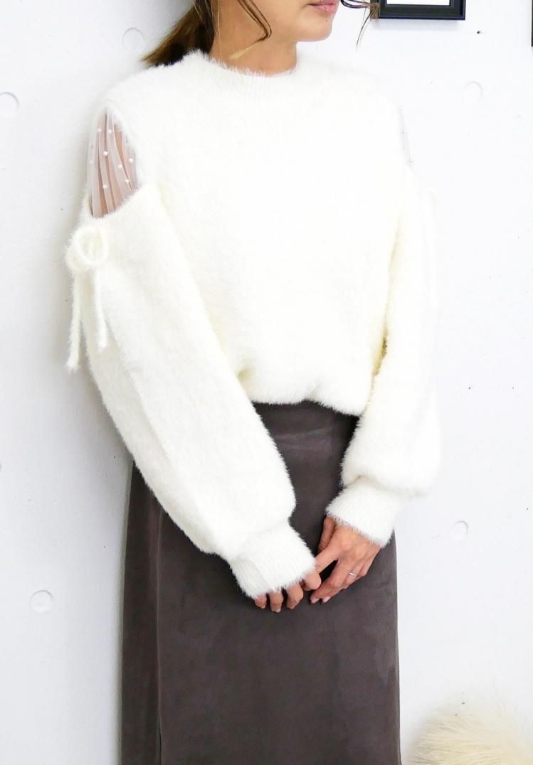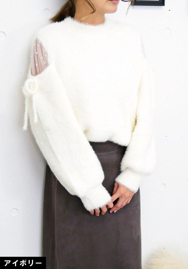 肩部分がパール付きシアー素材に切り替えられており、華やかさと肌の透け感による抜け感で、腕を細く見せる華奢見え効果も期待◎