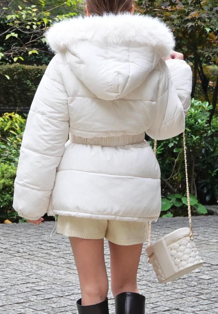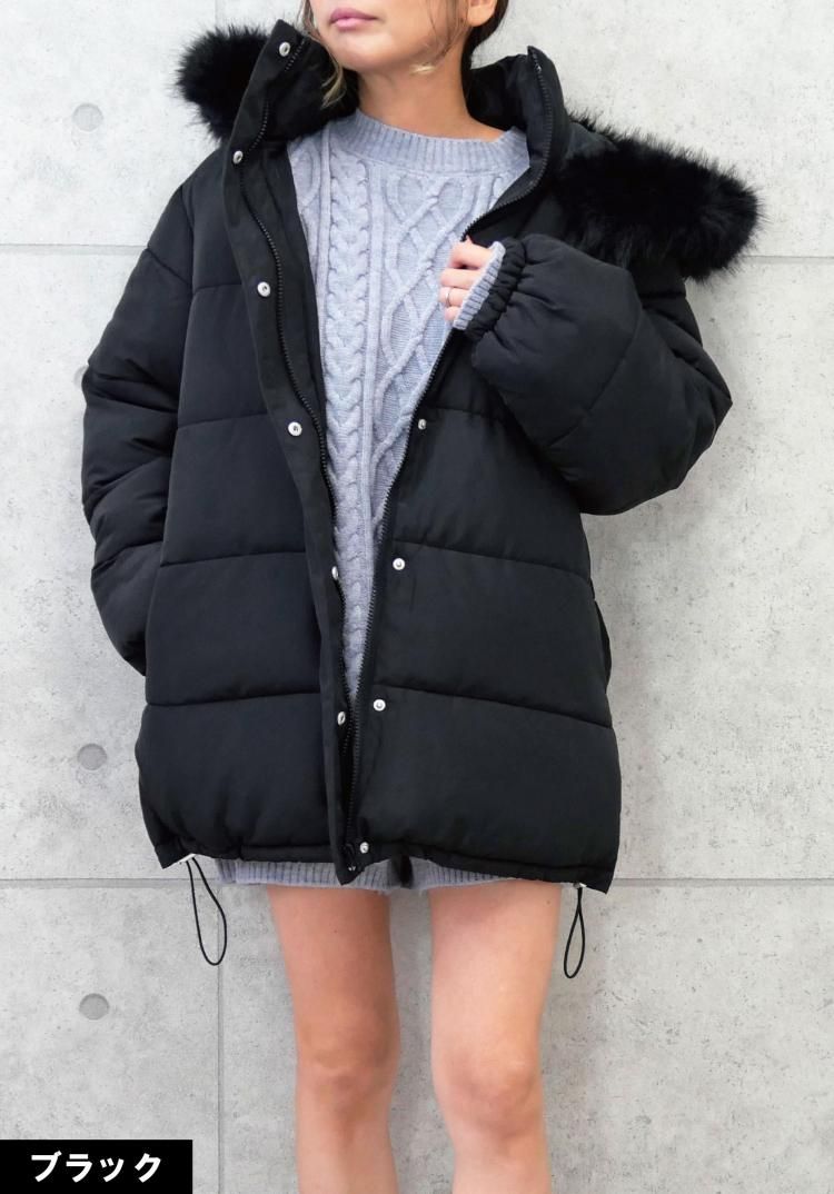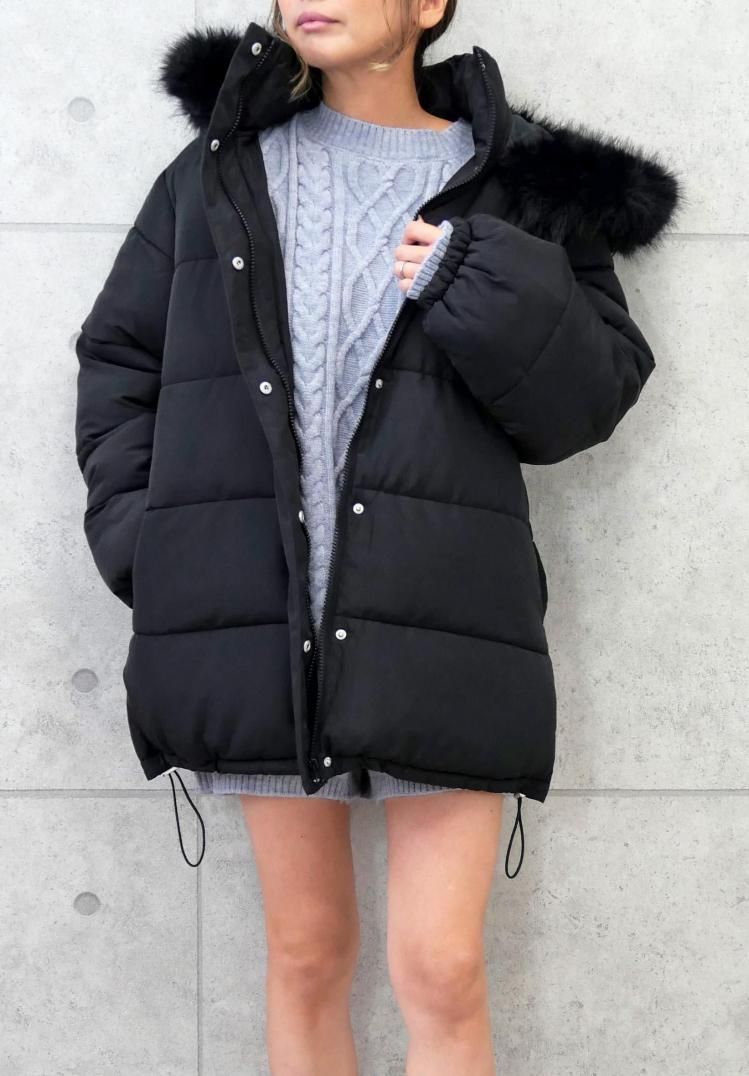 フード周りに豪華なフェイクファーがあしらわれており、顔周りや手元を華やかに見せ、女性らしいリッチな印象を与える中綿コート。