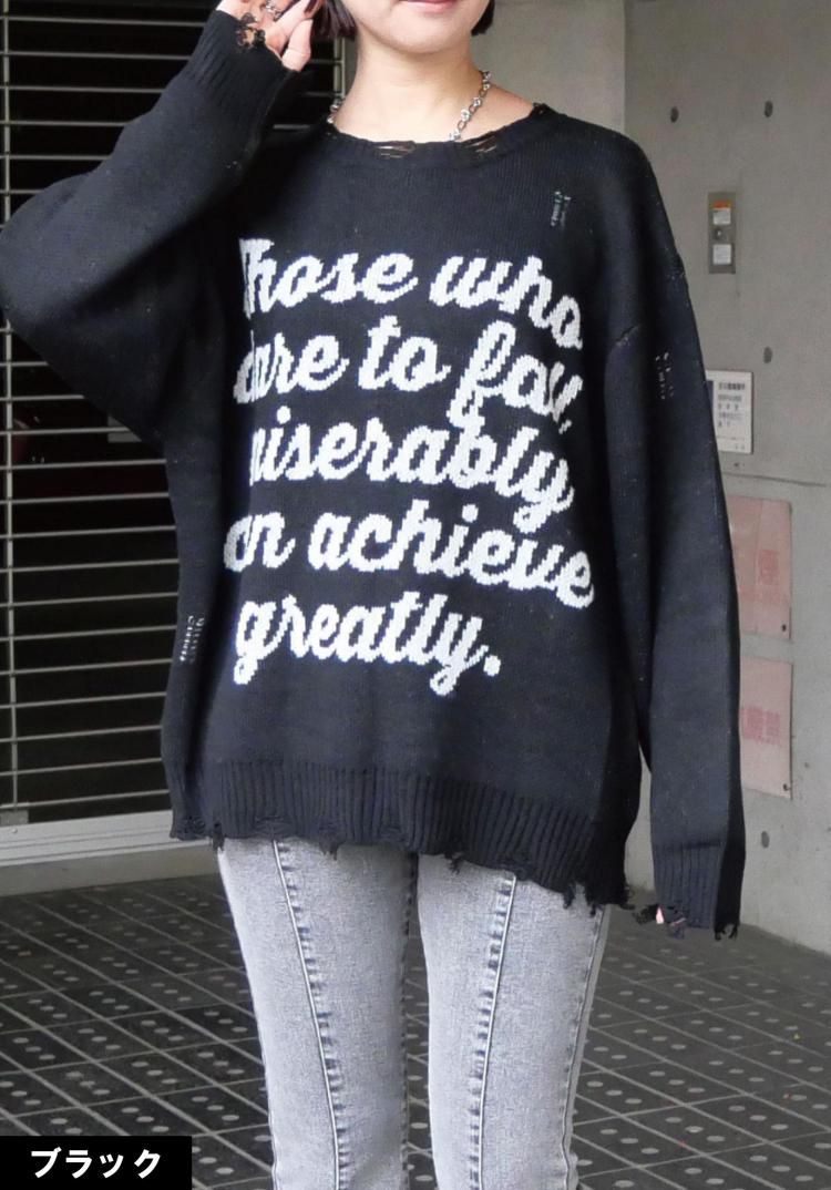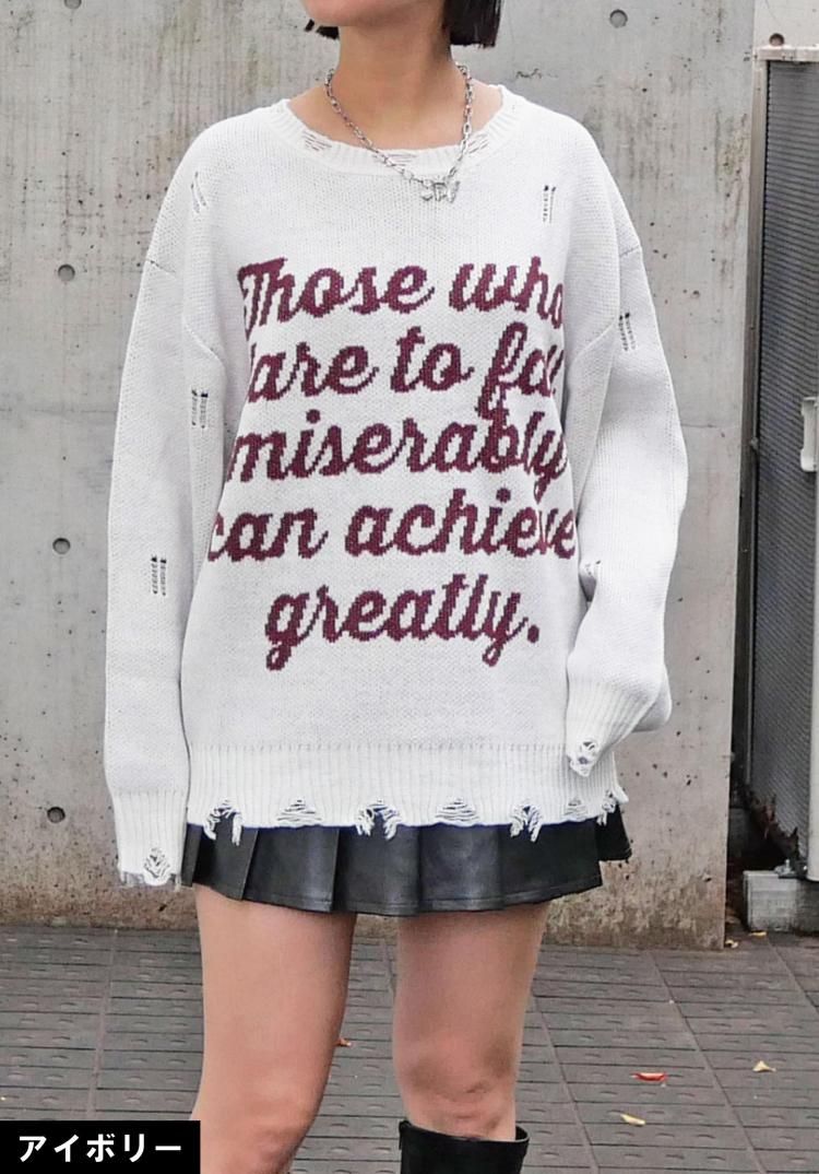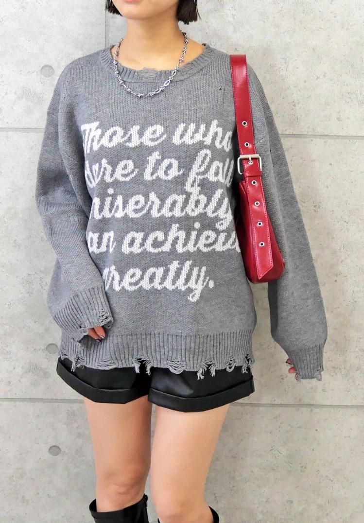 所々に入ったダメージ加工が旬なストリート感やグランジテイストを演出し、手軽にこなれ感が出せるロゴニット。