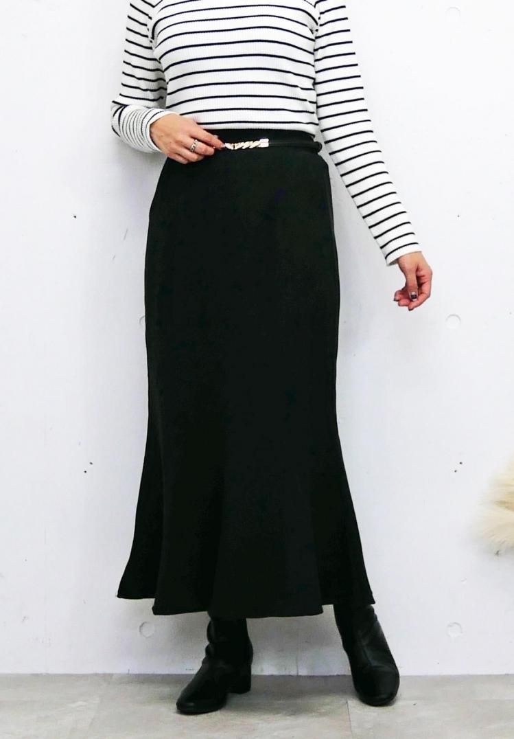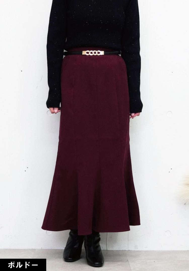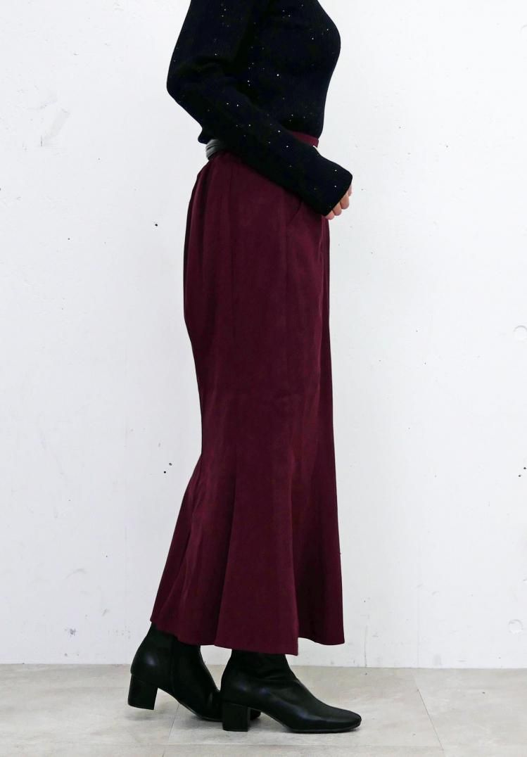 微起毛素材が秋冬らしい温かみを演出し、上品で女性らしい印象を与えるマーメイドスカート。